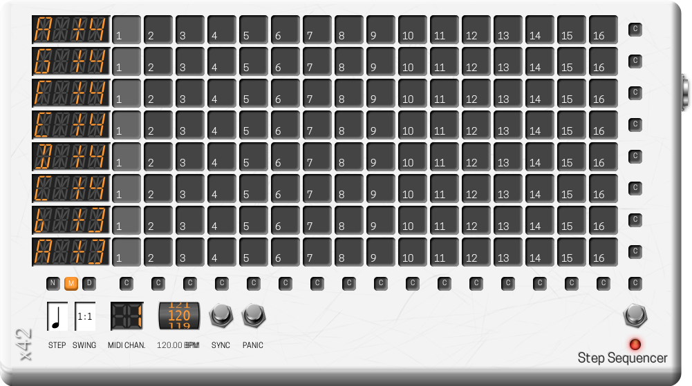 A simple step sequencer. It allows to trigger MIDI note events placed on a time/note grid. The Step-duration is configurable to musical time and can optionally be modulated for a swing-time effect. This plugin version contains 16 notes and 8 steps. Features: Modeled by x42